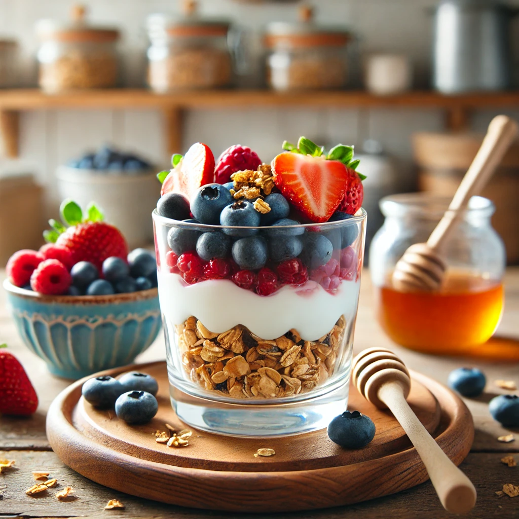 - Layer Greek yogurt, granola, and fresh berries in a bowl or glass.